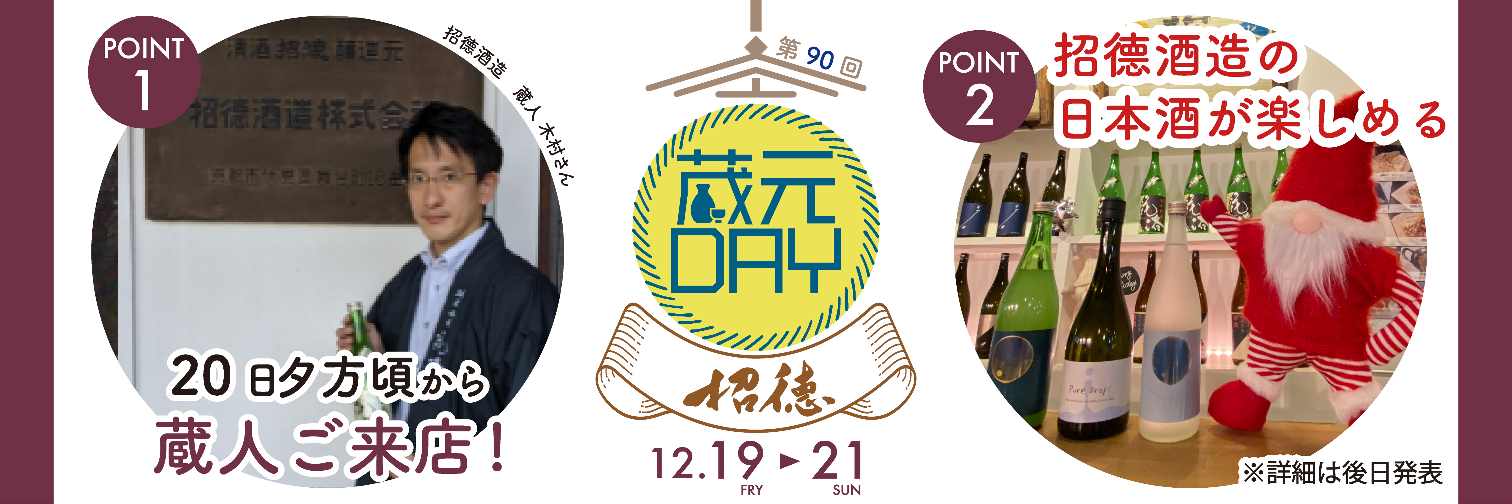 12月の蔵元DAY!は12月19日(金)〜12月21日(日)に開催します。 今回は【招德酒造】さん! なんと!3日間限定”で酒蔵小路で取り扱いのある城陽酒造のお酒を飲み放題!??詳細は後日インスタグラムで発表! さらに!…